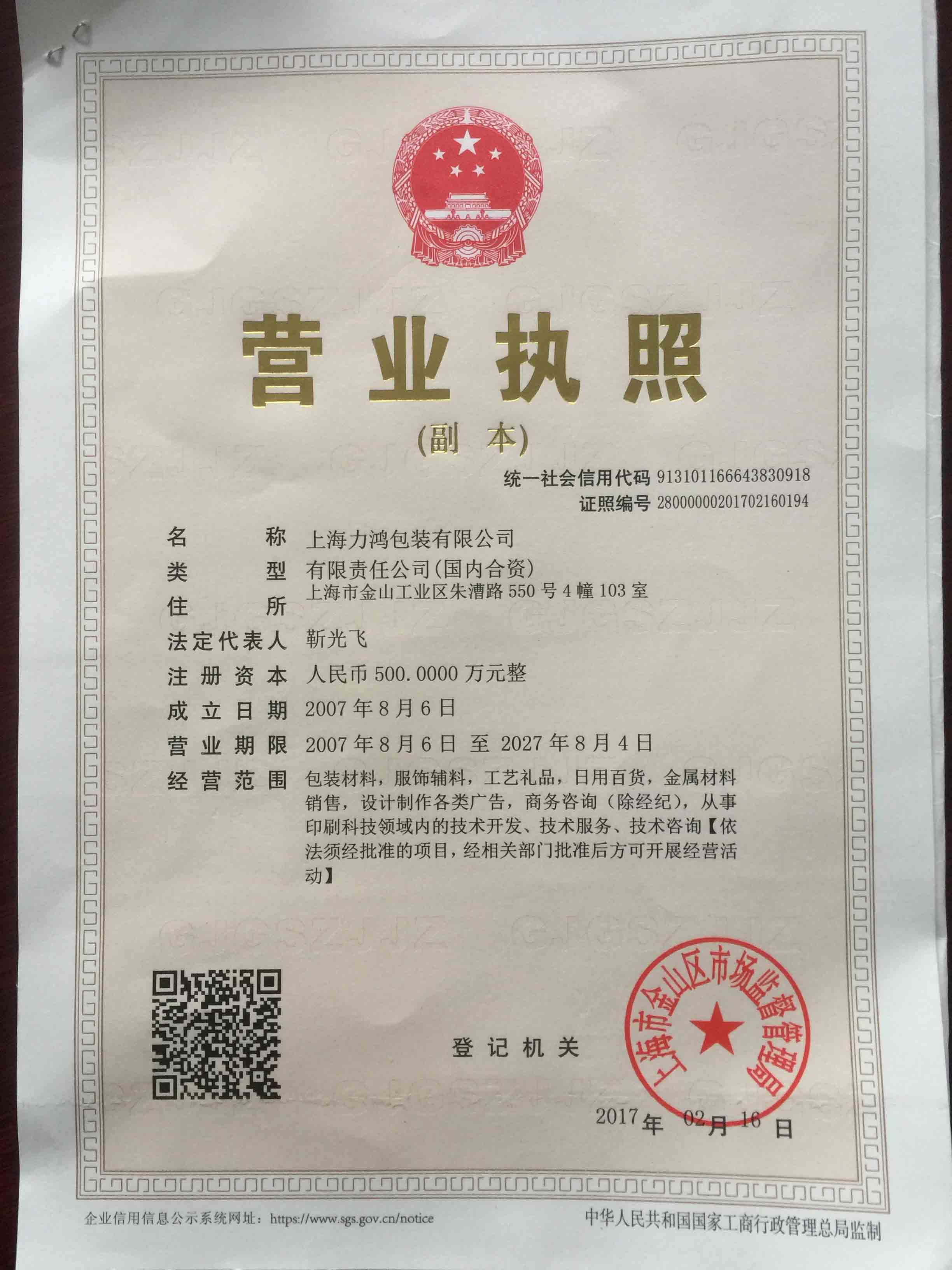 力鴻包裝有限公司創(chuàng)立于2007年,位于上海大虹橋商圈,毗鄰國家會展中心,廠區(qū)建筑面積15000多平方米,公司經(jīng)過十幾年的高速發(fā)展,現(xiàn)已成為一家以生產(chǎn)紙制品、印刷包裝為主的中大型專業(yè)印刷企業(yè)。公司主要產(chǎn)品包括彩盒、無紡布袋、 無紡布保溫袋、馬夾袋、彩卡、紙袋及精美手工禮盒等。我們擁有德國先進的海德堡(HAIDELBERG)印刷機和羅蘭印刷機3臺,同時配套了完善的印前數(shù)碼設備和印后自動化加工設備。